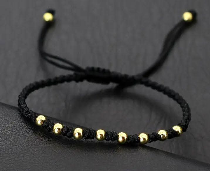 - Materiale: șnur textil cerat sau elastic, biluțe metalice aurii (aliaj antialergic)