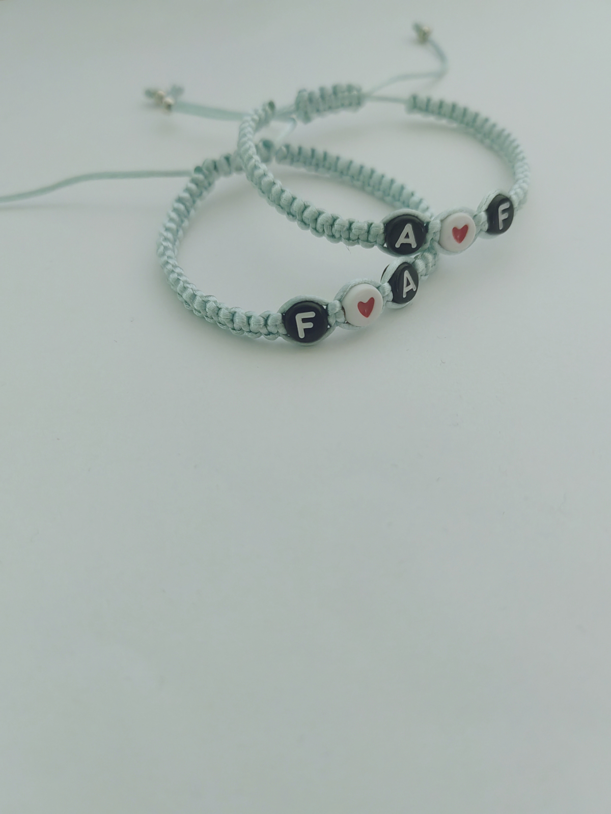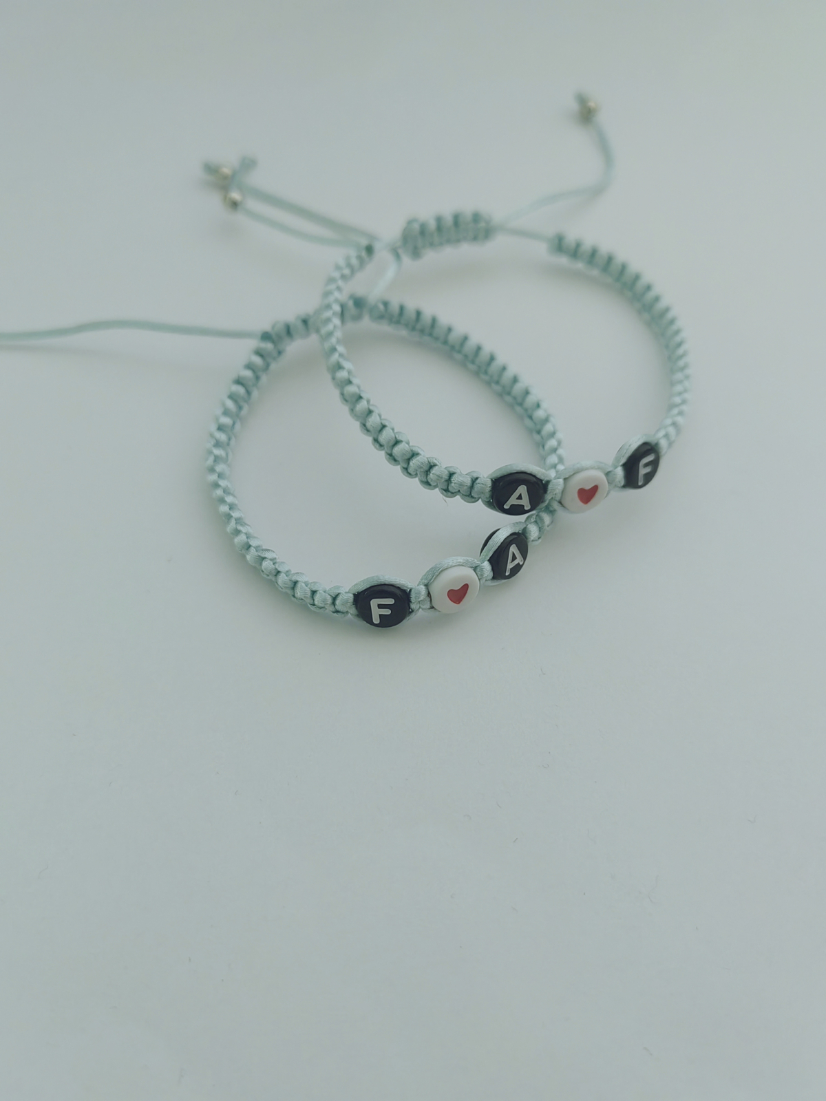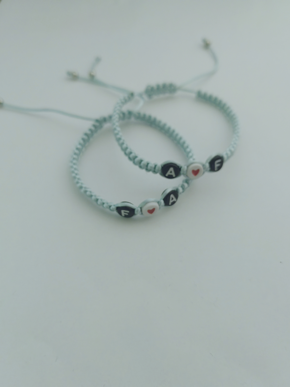 Un set creat special pentru voi doi – două brățări simbolice, fiecare cu inițialele voastre și o inimioară care le unește. Pe șnur albastru închis, acest set transmite emoție, loialitate și legătura voastră unică.