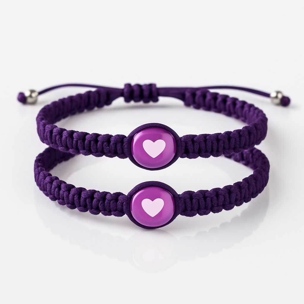 Set de doua bratari reglabila,impletite manua din snur mov.Fiecare bratara are in centru o margea rotunda,mov deschis decorata cu inima alba.Se ajusteaza usor datorita sistemului cu snur glisant si sunt potrivite atat pentru cupuri ,cat si pentru prieteni.
